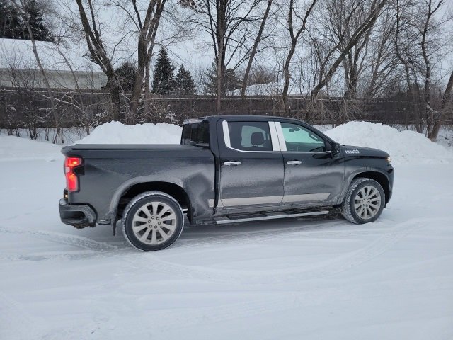 This Silverado 1500 is well equipped with High Country Deluxe (Power Sunroof and All-Weather Floor Liner (LPO)), Preferred Equipment Group 3LZ (10-Way Power Driver Seat w/Lumbar, 10-Way Power Passenger Seat Adjuster w/Lumbar, 120-Volt Bed Mounted Power Outlet, Advanced Trailering System, Auto-Dimming Inside Rear-View Mirror, Auto-Locking Rear Differential, Auxiliary External Transmission Oil Cooler, Chevytec Spray-On Black Bedliner, Chrome Assist Steps, Compass, Heated Driver & Front Outboard Passenger Seats, Heated Steering Wheel, Hitch Guidance w/Hitch View, Integrated Trailer Brake Controller, Keyless Open & Start, Lane Change Alert w/Side Blind Zone Alert, Leather Wrapped Steering Wheel, LED Cargo Area Lighting, Power Sliding Rear Window w/Rear Defogger, Power Tailgate, Rear Cross Traffic Alert, Remote Vehicle Starter System, Ultrasonic Front & Rear Park Assist, Ventilated Driver & Front Passenger Seats, Wireless Charging, 12-Volt Rear Auxiliary Power Outlet, 120-Volt Instrument Panel Power Outlet, 4G LTE Wi-Fi Hot Spot Capable, 8 Driver Information Center, Bluetooth® For Phone, Chevrolet Connected Access Capable, Chrome Grille, Chrome Recovery Hooks, Color-Keyed Carpeting Floor Covering, Deep-Tinted Glass, Driver Memory, Dual Exhaust w/Polished Outlets, Electric Rear-Window Defogger, Electrical Lock Control Steering Column, Electronic Cruise Control, Floor Mounted Center Console, Front Carpeted Floor Mats, Front LED Fog Lamps, HD Rear Vision Camera, Manual Tilt/Telescoping Steering Column, OnStar & Chevrolet Connected Services Capable, Outside Heated Power-Adjustable Mirrors, Painted Mirror Caps, Power Door Locks, Power Front Passenger Windows w/Express Up/Down, Power Front Windows w/Driver Express Up/Down, Power Rear Windows w/Express Down, Rear Carpeted Floor Mats, Rear Dual USB Charging-Only Ports, Rear Wheelhouse Liners, SiriusXM w/360L, Steering Wheel Audio Controls, Theft Deterrent System (Unauthorized Entry), Universal Home Remote, and Wireless Phone Projection), Safety Package II (Adaptive Cruise Control, Automatic Emergency Braking, Forward Collision Alert, Front Pedestrian Braking, Lane Keep Assist w/Lane Departure Warning, Safety Alert Seat, Following Distance Indicator, and IntelliBeam Automatic High Beam On/Off), Trailering Package (Hitch Guidance), Up-Level Rear Seat w/Storage Package, Navigation System, Wheels: 22 x 9 Polished Aluminum, 170 Amp Alternator, 3.23 Rear Axle Ratio, 4-Wheel Disc Brakes, 7 Speakers, ABS brakes, Adaptive Ride Control Suspension, Air Conditioning, Alloy wheels, AM/FM radio: SiriusXM with 360L, Apple CarPlay/Android Auto, Auto-dimming door mirrors, Au