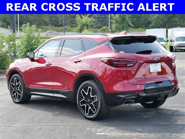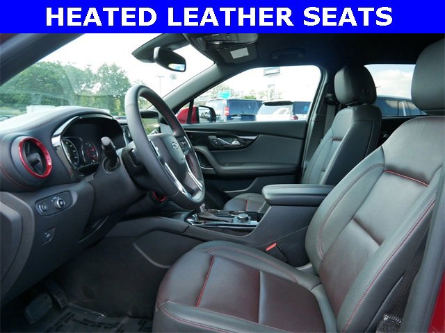 This Blazer is well equipped with Preferred Equipment Group 1RS (Heated Steering Wheel and Rear Park Assist w/Audible Warning), 6-Way Power Front Passenger Seat Adjuster, 8-Way Power Driver Seat Adjuster, Apple CarPlay/Android Auto, Auto-dimming door mirrors, Automatic temperature control, Black Lug Nut & Wheel Lock Kit (LPO), Bose Premium 8-Speaker Audio System Feature, Compass, Dual front impact airbags, Dual front side impact airbags, Electronic Stability Control, Fully automatic headlights, Garage door transmitter, Heated door mirrors, Heated Driver & Front Passenger Seats, Knee airbag, Navigation System, Outside temperature display, Overhead airbag, Perforated Leather-Appointed Seat Trim, Power door mirrors, Power Liftgate, Radio: Chevrolet Infotainment 3 Premium System, Security system, SiriusXM w/360L, Wheels: 21 High Gloss Black w/Machined Face, 3.49 Final Drive Axle Ratio, 4-Wheel Disc Brakes, 8 Speakers, ABS brakes, Air Conditioning, Alloy wheels, AM/FM radio: SiriusXM with 360L, Auto High-beam Headlights, Auto-dimming Rear-View mirror, Brake assist, Bumpers: body-color, Child-Seat-Sensing Airbag, Delay-off headlights, Driver door bin, Driver vanity mirror, Emergency communication system: OnStar and Chevrolet connected services capable, Four wheel independent suspension, Front anti-roll bar, Front Bucket Seats, Front Center Armrest, Front dual zone A/C, Front reading lights, Heated front seats, Heated steering wheel, Illuminated entry, Leather Shift Knob, Low tire pressure warning, Not Equipped w/Rear Park Assist, Occupant sensing airbag, Overhead console, Panic alarm, Passenger door bin, Passenger vanity mirror, Power Driver Lumbar Control, Power driver seat, Power passenger seat, Power steering, Power windows, Premium audio system: Chevrolet Infotainment 3 Premium, Radio data system, Rear anti-roll bar, Rear reading lights, Rear seat center armrest, Rear window defroster, Rear window wiper, Remote keyless entry, Ride & Handling Suspension, Speed control, Speed-sensing steering, Split folding rear seat, Spoiler, Steering wheel mounted audio controls, Tachometer, Telescoping steering wheel, Tilt steering wheel, Traction control, Trip computer, Turn signal indicator mirrors, Variably intermittent wipers, and Voltmeter.