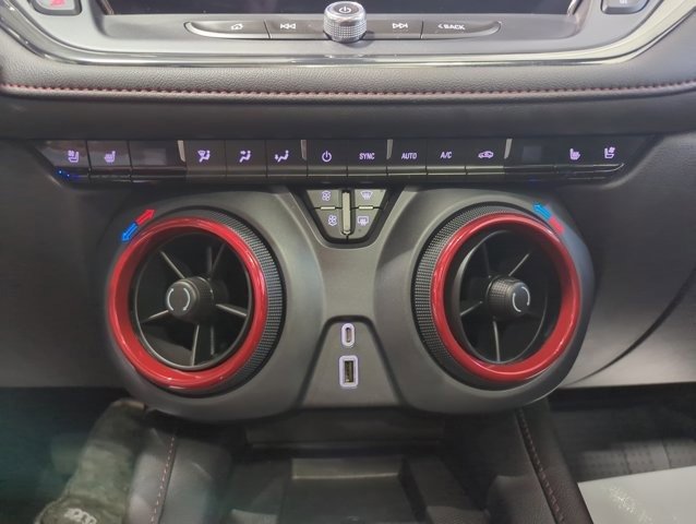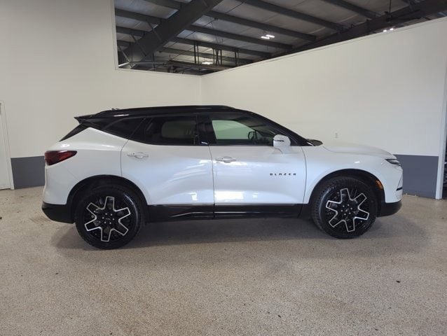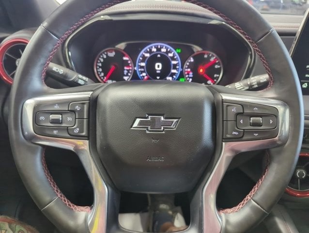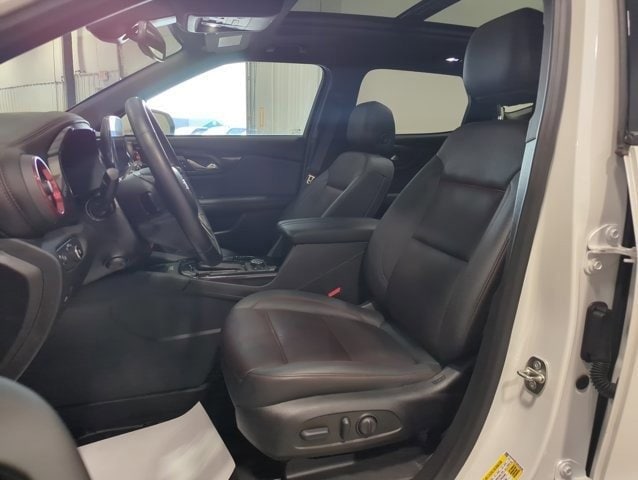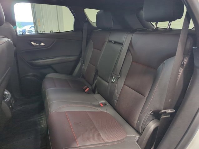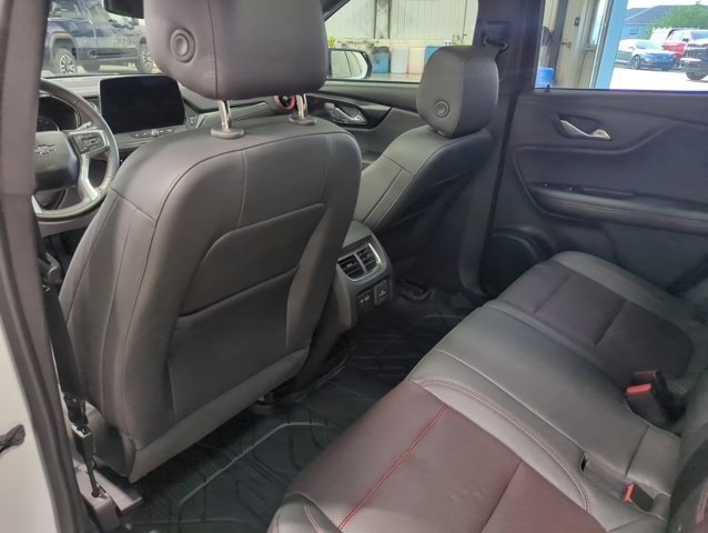 This Blazer is well equipped with Enhanced Convenience Package (Heated Rear Outboard Seating Positions, Memory Settings For Driver Seat & Exterior Mirrors, Ventilated Driver & Front Passenger Seats, and Power Tilt & Telescoping Steering Column), Preferred Equipment Group 1RS (Heated Steering Wheel and Rear Park Assist w/Audible Warning), Floor Liner Package (LPO) (1st & 2nd Row All-Weather Floor Liners (LPO) and Integrated Cargo Liner (LPO)), Black 2-Tone Roof, Navigation System, Power Liftgate, Power Panoramic Tilt-Sliding Sunroof, Wheels: 21 High Gloss Black w/Machined Face, 3.49 Final Drive Axle Ratio, 4-Wheel Disc Brakes, 6-Way Power Front Passenger Seat Adjuster, 8 Speakers, 8-Way Power Driver Seat Adjuster, ABS brakes, Air Conditioning, Alloy wheels, AM/FM radio: SiriusXM with 360L, Apple CarPlay/Android Auto, Auto High-beam Headlights, Auto-dimming door mirrors, Auto-dimming Rear-View mirror, Automatic temperature control, Bose Premium 8-Speaker Audio System Feature, Brake assist, Bumpers: body-color, Child-Seat-Sensing Airbag, Compass, Delay-off headlights, Driver door bin, Driver vanity mirror, Dual front impact airbags, Dual front side impact airbags, Electronic Stability Control, Emergency communication system: OnStar and Chevrolet connected services capable, Four wheel independent suspension, Front anti-roll bar, Front Bucket Seats, Front Center Armrest, Front dual zone A/C, Front reading lights, Fully automatic headlights, Garage door transmitter, Heated door mirrors, Heated Driver & Front Passenger Seats, Heated front seats, Heated steering wheel, Illuminated entry, Knee airbag, Leather Shift Knob, Low tire pressure warning, Not Equipped w/Rear Park Assist, Occupant sensing airbag, Outside temperature display, Overhead airbag, Overhead console, Panic alarm, Passenger door bin, Passenger vanity mirror, Perforated Leather-Appointed Seat Trim, Power door mirrors, Power Driver Lumbar Control, Power driver seat, Power passenger seat, Power steering, Power windows, Premium audio system: Chevrolet Infotainment 3 Premium, Radio data system, Radio: Chevrolet Infotainment 3 Premium System, Rear anti-roll bar, Rear reading lights, Rear seat center armrest, Rear window defroster, Rear window wiper, Remote keyless entry, Ride & Handling Suspension, Security system, SiriusXM w/360L, Speed control, Speed-sensing steering, Split folding rear seat, Spoiler, Steering wheel mounted audio controls, Tachometer, Telescoping steering wheel, Tilt steering wheel, Traction control, Trip computer, Turn signal indicator mirrors, Variably intermittent wipers, and Voltmeter.