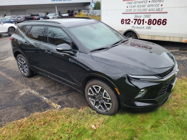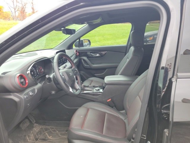 This Blazer is well equipped with Driver Confidence II Package (Adaptive Cruise Control, HD Surround Vision, Enhanced Automatic Emergency Braking, Rear Camera Mirror, Rear Camera Mirror Washer, and Safety Alert Seat), Enhanced Convenience Package (Heated Rear Outboard Seating Positions, Memory Settings For Driver Seat & Exterior Mirrors, Ventilated Driver & Front Passenger Seats, and Power Tilt & Telescoping Steering Column), Preferred Equipment Group 1RS (Heated Steering Wheel), Bose Premium 8-Speaker Audio System Feature, Heated Driver & Front Passenger Seats, Navigation System, Power Liftgate, Power Panoramic Tilt-Sliding Sunroof, Wheels: 20 Technical Gray Aluminum, 3.49 Final Drive Axle Ratio, 4-Wheel Disc Brakes, 6-Way Power Front Passenger Seat Adjuster, 8 Speakers, 8-Way Power Driver Seat Adjuster, ABS brakes, Air Conditioning, Alloy wheels, AM/FM radio: SiriusXM with 360L, Apple CarPlay/Android Auto, Auto High-beam Headlights, Auto-dimming door mirrors, Auto-dimming Rear-View mirror, Automatic temperature control, Brake assist, Bumpers: body-color, Child-Seat-Sensing Airbag, Compass, Delay-off headlights, Driver door bin, Driver vanity mirror, Dual front impact airbags, Dual front side impact airbags, Electronic Stability Control, Emergency communication system: OnStar and Chevrolet connected services capable, Four wheel independent suspension, Front anti-roll bar, Front Bucket Seats, Front Center Armrest, Front dual zone A/C, Front reading lights, Fully automatic headlights, Garage door transmitter, Heated door mirrors, Heated front seats, Heated steering wheel, Illuminated entry, Knee airbag, Leather Shift Knob, Leather steering wheel, Low tire pressure warning, Occupant sensing airbag, Outside temperature display, Overhead airbag, Overhead console, Panic alarm, Passenger door bin, Passenger vanity mirror, Perforated Leather-Appointed Seat Trim, Power door mirrors, Power Driver Lumbar Control, Power driver seat, Power passenger seat, Power steering, Power windows, Premium audio system: Chevrolet Infotainment 3 Premium, Radio data system, Radio: Chevrolet Infotainment 3 Premium System, Rear anti-roll bar, Rear reading lights, Rear seat center armrest, Rear window defroster, Rear window wiper, Remote keyless entry, Ride & Handling Suspension, Security system, SiriusXM w/360L, Speed control, Speed-sensing steering, Split folding rear seat, Spoiler, Steering wheel mounted audio controls, Tachometer, Telescoping steering wheel, Tilt steering wheel, Traction control, Trip computer, Turn signal indicator mirrors, Variably intermittent wipers, and Voltmeter.
