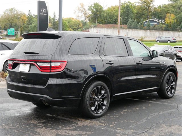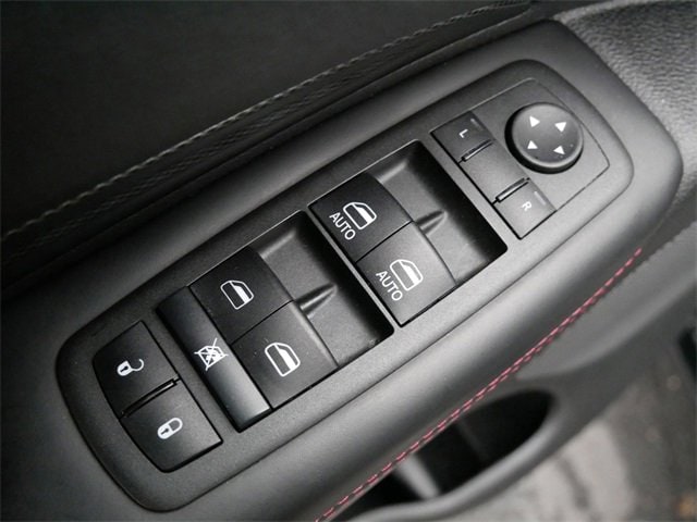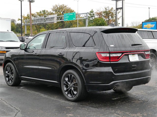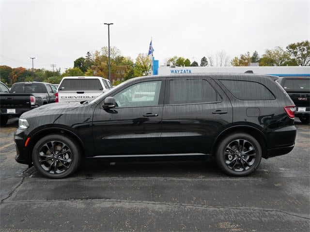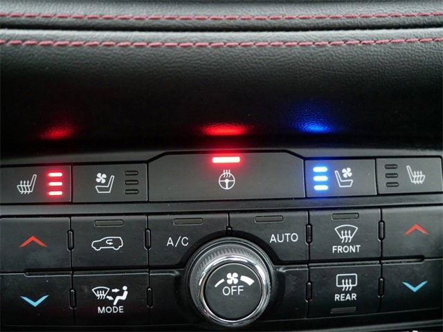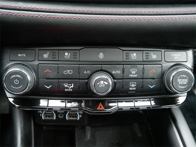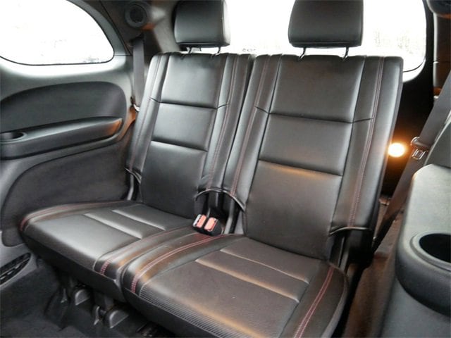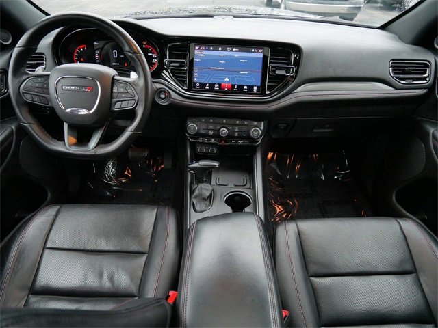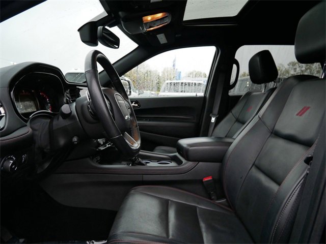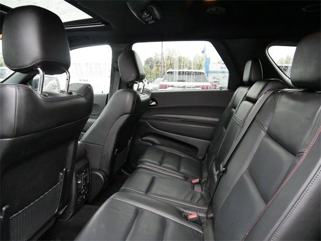 This Durango is well equipped with Blacktop Package (Gloss Black Badges, Gloss Black Exterior Mirrors, and Satin Black Dodge Tail Lamp Badge), Quick Order Package 22S R/T, Apple CarPlay/Android Auto, Heated front seats, Heated rear seats, Heated steering wheel, Navigation system: TomTom, Power Sunroof, Ventilated Front Seats, Wheels: 20 x 8.0 Black Noise Aluminum, 3.09 Rear Axle Ratio, 3rd row seats: split-bench, 4-Wheel Disc Brakes, 9 Speakers, ABS brakes, Air Conditioning, Alloy wheels, AM/FM radio: SiriusXM w/360L, Anti-whiplash front head restraints, Audio memory, Auto High-beam Headlights, Auto-dimming door mirrors, Auto-dimming Rear-View mirror, Auto-leveling suspension, Automatic temperature control, Brake assist, Bumpers: body-color, Compass, Delay-off headlights, Driver door bin, Driver vanity mirror, Dual front impact airbags, Dual front side impact airbags, Electronic Stability Control, Emergency communication system: SiriusXM Guardian, Four wheel independent suspension, Front anti-roll bar, Front Bucket Seats, Front Center Armrest w/Storage, Front dual zone A/C, Front fog lights, Front reading lights, Fully automatic headlights, Garage door transmitter, Heated door mirrors, Heavy-Duty Engine Cooling, Illuminated entry, Knee airbag, Leather steering wheel, Leather Suede Bucket Seats, Low tire pressure warning, Memory seat, Occupant sensing airbag, Outside temperature display, Overhead airbag, Overhead console, Panic alarm, ParkView Rear Back-Up Camera, Passenger door bin, Passenger vanity mirror, Power door mirrors, Power driver seat, Power Liftgate, Power passenger seat, Power steering, Power windows, Radio data system, Radio: Uconnect 5 Nav w/10.1 Display, Rain sensing wipers, Rear air conditioning, Rear anti-roll bar, Rear Load Leveling Suspension, Rear reading lights, Rear seat center armrest, Rear window defroster, Rear window wiper, Remote keyless entry, Security system, Speed control, Speed-sensing steering, Speed-Sensitive Wipers, Split folding rear seat, Spoiler, Steering wheel mounted audio controls, Tachometer, Telescoping steering wheel, Tilt steering wheel, Traction control, Trip computer, Turn signal indicator mirrors, Variably intermittent wipers, and Voltmeter.