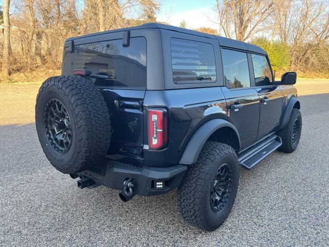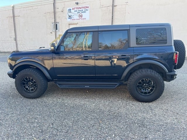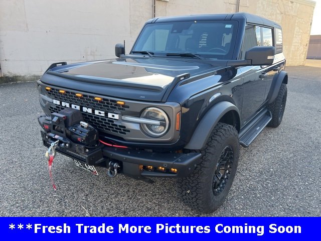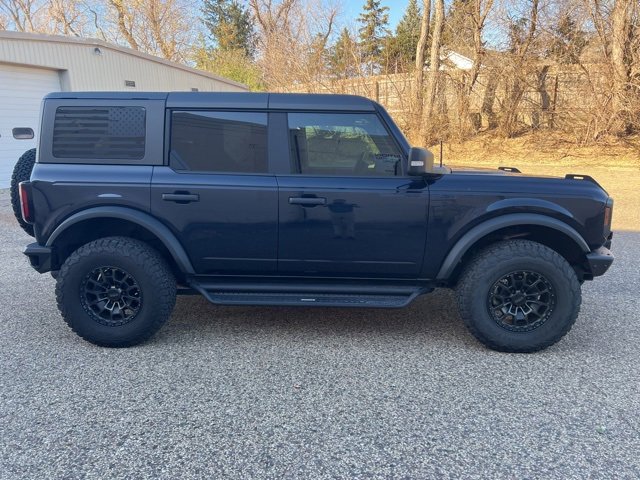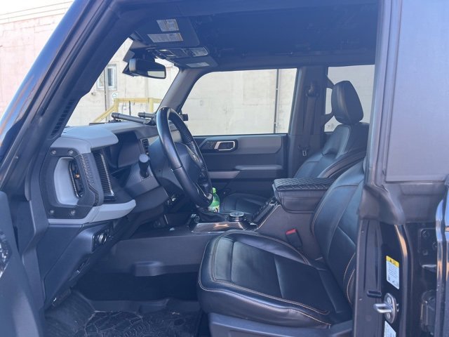 This Bronco is well equipped with Equipment Group 334A Lux Package (12 LCD Capacitive Touchscreen w/Swipe Capability, 360-Degree Camera, Adaptive Cruise Control, Connected Built-In Navigation, Evasive Steering Assist, Forward Sensing System, Front Row Heated Seats, Heated Steering Wheel, Radio: B&O Sound System by Bang & Olufsen, Reverse Sensing System, Wireless Charging Pad, 2 Smart Charging USB Ports In Dashboard, 2-Door Intelligent Access w/Lock/Unlock, Additional Sound Deadening, Ambient Footwell Lighting, Auto-Dimming Interior Rear-View Mirror, Dr & Pass Illuminated Sliding Visor Vanity Mirrors, Dual-Zone Electronic Automatic Temperature Control, Enhanced Voice Recognition, Information on Demand Panel, Power Outlet - Back Side of Center Floor Console, Sideview Mirrors, and Universal Garage Door Opener), 4-Wheel Disc Brakes, 4.7 Axle Ratio, 6 Speakers, ABS brakes, Air Conditioning, Alloy wheels, AM/FM radio: SiriusXM with 360L, AM/FM Stereo, Auto High-beam Headlights, Brake assist, Compass, Delay-off headlights, Driver door bin, Driver vanity mirror, Dual front impact airbags, Dual front side impact airbags, Emergency communication system: 911 Assist, Exterior Parking Camera Rear, Front anti-roll bar, Front Bucket Seats, Front Center Armrest, Front License Plate Bracket, Front reading lights, Front wheel independent suspension, Fully automatic headlights, Heated door mirrors, Illuminated entry, Integrated roll-over protection, Leather Shift Knob, Low tire pressure warning, Marine Grade Vinyl Bucket Seats, Occupant sensing airbag, Outside temperature display, Overhead airbag, Overhead console, Panic alarm, Passenger door bin, Passenger vanity mirror, Power door mirrors, Power steering, Power windows, Radio data system, Remote keyless entry, Security system, SiriusXM Radio w/360L, Speed control, Split folding rear seat, Steering wheel mounted audio controls, SYNC 4, Tachometer, Telescoping steering wheel, Tilt steering wheel, Traction control, Trip computer, Variably intermittent wipers, Voltmeter, and Wheels: 17 Machined Carbonized Aluminum.