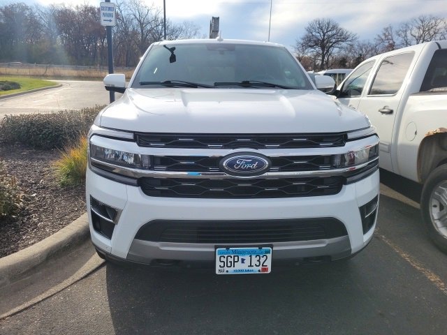 This Expedition is well equipped with Equipment Group 301A Mid Package (Panoramic Vista Roof), Navigation system: Connected Navigation, 12 Speakers, 3.31 Axle Ratio, 3rd row seats: split-bench, 4-Wheel Disc Brakes, ABS brakes, Adjustable pedals, Air Conditioning, Alloy wheels, AM/FM radio: SiriusXM with 360L, Auto High-beam Headlights, Auto-dimming door mirrors, Auto-dimming Rear-View mirror, Automatic temperature control, Brake assist, Bumpers: body-color, Compass, Delay-off headlights, Driver door bin, Driver vanity mirror, Dual front impact airbags, Dual front side impact airbags, Electronic Stability Control, Emergency communication system: SYNC 4 911 Assist, Exterior Parking Camera Rear, Four wheel independent suspension, Front anti-roll bar, Front Bucket Seats, Front Center Armrest, Front dual zone A/C, Front fog lights, Front License Plate Bracket, Front reading lights, Fully automatic headlights, Garage door transmitter, Heated & Ventilated Leather Front Captain's Chairs, Heated door mirrors, Heated front seats, Heated rear seats, Heated steering wheel, Illuminated entry, Leather steering wheel, Low tire pressure warning, Memory seat, Occupant sensing airbag, Outside temperature display, Overhead airbag, Overhead console, Panic alarm, Passenger door bin, Passenger vanity mirror, Pedal memory, Power door mirrors, Power driver seat, Power Liftgate, Power moonroof, Power passenger seat, Power steering, Power windows, Radio data system, Radio: B&O Sound System by Bang & Olufsen, Rain sensing wipers, Rear air conditioning, Rear anti-roll bar, Rear reading lights, Rear window defroster, Rear window wiper, Reclining 3rd row seat, Remote keyless entry, Second Row Power Windows Removal, Security system, SiriusXM w/360L, Speed control, Speed-sensing steering, Speed-Sensitive Wipers, Split folding rear seat, Spoiler, Steering wheel memory, Steering wheel mounted audio controls, SYNC 4 w/Enhanced Voice Recognition, Tachometer, Telescoping steering wheel, Tilt steering wheel, Traction control, Trip computer, Turn signal indicator mirrors, Variably intermittent wipers, Ventilated front seats, Voltmeter, and Wheels: 20 Bright Machined Aluminum.