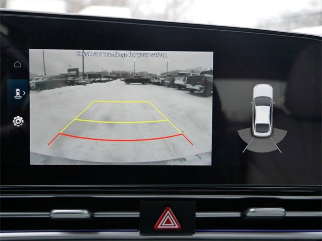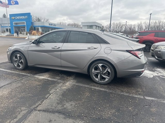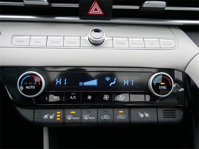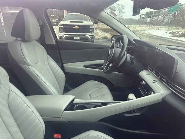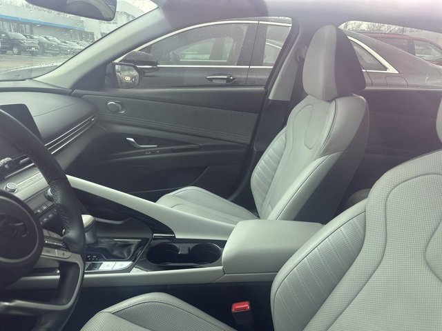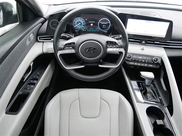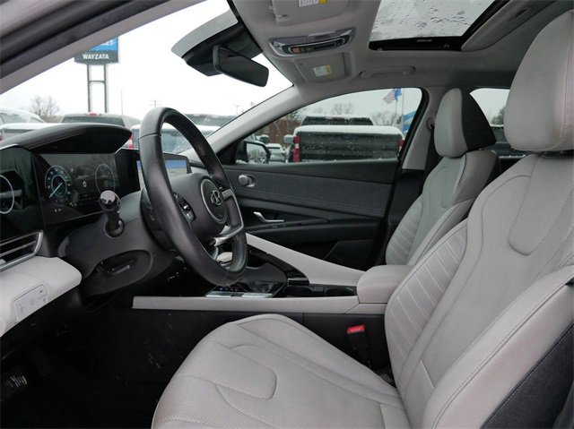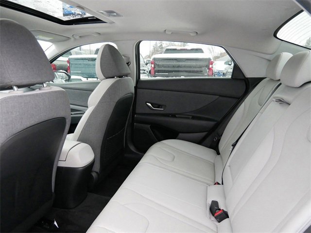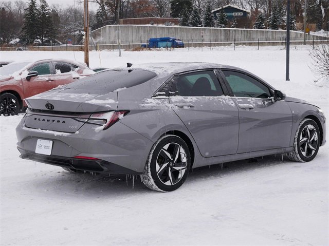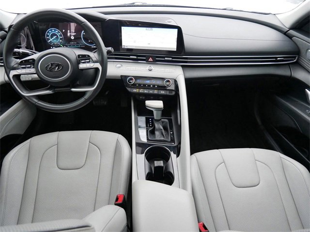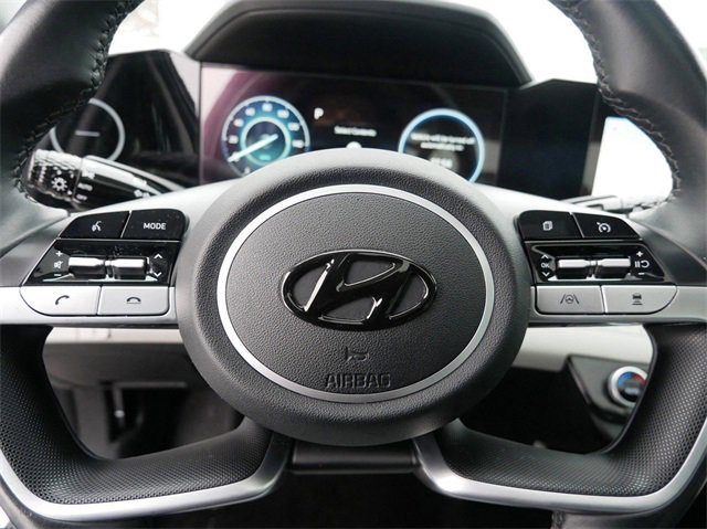 This Elantra Hybrid is well equipped with Cargo Package (Cargo Block, Cargo Net, and Reversible Cargo Tray), Option Group 01, Apple CarPlay & Android Auto, Heated & Ventilated Front Bucket Seats, Leather-Trimmed Seating Surfaces, Navigation System, Power moonroof, 17 x 7.0J Alloy Wheels, 4-Wheel Disc Brakes, 8 Speakers, ABS brakes, Air Conditioning, Alloy wheels, AM/FM radio: SiriusXM, Auto High-beam Headlights, Auto-dimming Rear-View mirror, Automatic temperature control, Brake assist, Bumpers: body-color, Carpeted Floor Mats, Delay-off headlights, Driver door bin, Driver vanity mirror, Dual front impact airbags, Dual front side impact airbags, Electronic Stability Control, Emergency communication system: Blue Link Connected Car Service (3-year complimentary subscription), Exterior Parking Camera Rear, Front anti-roll bar, Front Bucket Seats, Front Center Armrest, Front dual zone A/C, Front reading lights, Front wheel independent suspension, Fully automatic headlights, Heated door mirrors, Heated front seats, Illuminated entry, Leather Shift Knob, Low tire pressure warning, Memory seat, Occupant sensing airbag, Outside temperature display, Overhead airbag, Overhead console, Panic alarm, Passenger door bin, Passenger vanity mirror, Power door mirrors, Power driver seat, Power steering, Power windows, Radio: AM/FM/HD/SiriusXM Display Audio, Rear seat center armrest, Rear window defroster, Remote keyless entry, Security system, Speed control, Speed-sensing steering, Split folding rear seat, Steering wheel mounted audio controls, Tachometer, Telescoping steering wheel, Tilt steering wheel, Traction control, Trip computer, Turn signal indicator mirrors, Variably intermittent wipers, and Ventilated front seats.