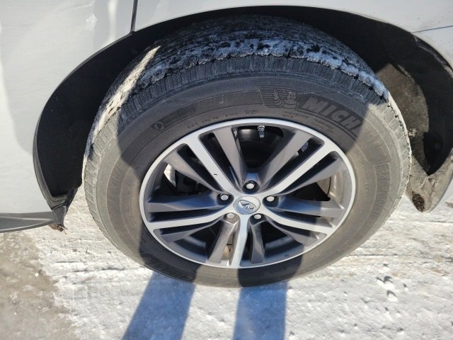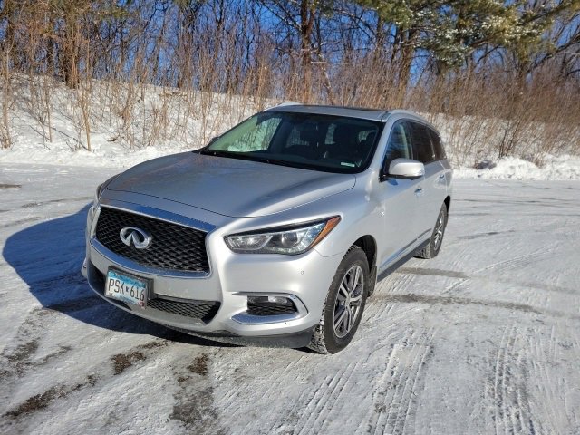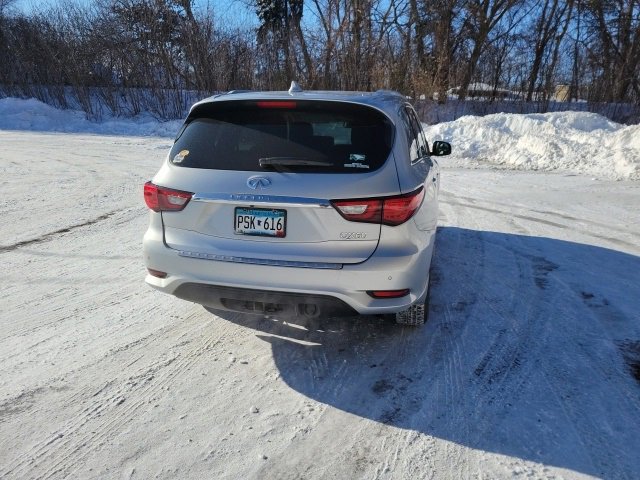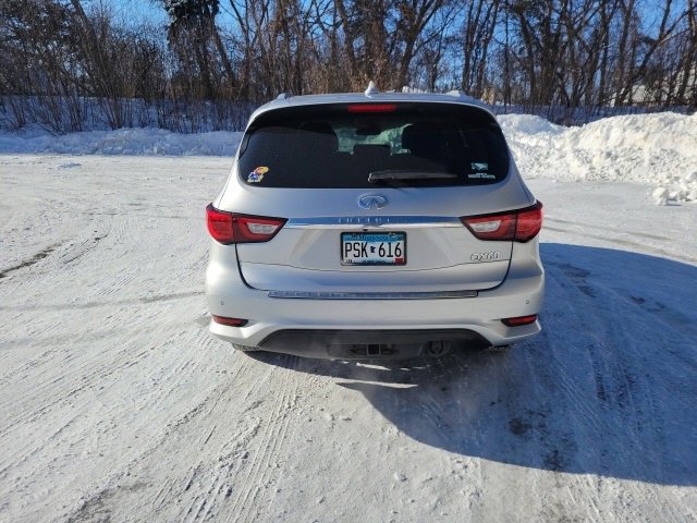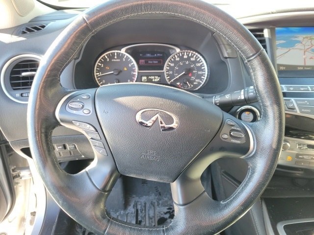 This QX60 is well equipped with Power moonroof, 3rd row seats: bench, 4-Wheel Disc Brakes, 5.17 Axle Ratio, 6 Speakers, ABS brakes, Air Conditioning, Alloy wheels, AM/FM radio: SiriusXM, AM/FM/CD/MP3 Audio System, Auto-dimming Rear-View mirror, Automatic temperature control, Bodyside moldings, Brake assist, Bumpers: body-color, CD player, Delay-off headlights, Driver door bin, Driver vanity mirror, Dual front impact airbags, Dual front side impact airbags, Electronic Stability Control, Four wheel independent suspension, Front anti-roll bar, Front Bucket Seats, Front Center Armrest w/Storage, Front dual zone A/C, Front fog lights, Front reading lights, Fully automatic headlights, Garage door transmitter, Heated door mirrors, Heated Front Seats, Heated front seats, High intensity discharge headlights: Bi-Xenon, Illuminated entry, Leather Shift Knob, Leather steering wheel, Leather-Appointed Seats, Low tire pressure warning, Occupant sensing airbag, Outside temperature display, Overhead airbag, Overhead console, Panic alarm, Passenger door bin, Passenger vanity mirror, Power door mirrors, Power driver seat, Power Liftgate, Power passenger seat, Power steering, Power windows, Radio data system, Rear air conditioning, Rear anti-roll bar, Rear reading lights, Rear seat center armrest, Rear window defroster, Rear window wiper, Reclining 3rd row seat, Remote keyless entry, Security system, Speed control, Speed-sensing steering, Speed-Sensitive Wipers, Split folding rear seat, Spoiler, Steering wheel mounted audio controls, Tachometer, Telescoping steering wheel, Tilt steering wheel, Traction control, Trip computer, Turn signal indicator mirrors, Variably intermittent wipers, and Wheels: 18 Triple 5-Spoke Aluminum-Alloy.