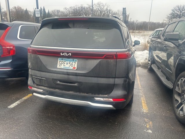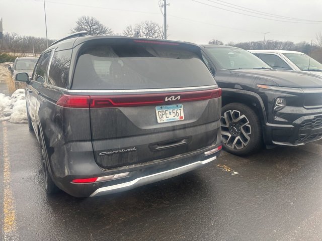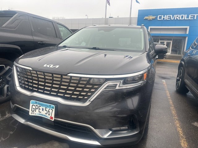 This Carnival is well equipped with 4-way Power Driver's Lumbar Support, 8 Way Power Driver's Seat, 8 Way Power Front Passenger's Seat, Apple CarPlay & Android Auto, Driver's Seat & Mirrors Memory System, Garage door transmitter: HomeLink, Heated & Ventilated Front Bucket Seats, Heated rear seats, Heated steering wheel, Navigation system: UVO eServices, Power 2nd-Row Moonroof, Power Liftgate, Power moonroof, Pure Leather Seat Trim, Ventilated rear seats, 12 Speakers, 3.51 Axle Ratio, 3rd row seats: split-bench, 4-Wheel Disc Brakes, ABS brakes, Air Conditioning, Alloy wheels, AM/FM radio: SiriusXM, Auto High-beam Headlights, Auto-dimming Rear-View mirror, Automatic temperature control, Brake assist, Bumpers: body-color, Compass, Delay-off headlights, Driver door bin, Driver vanity mirror, Dual front impact airbags, Dual front side impact airbags, Electronic Stability Control, Emergency communication system: UVO eServices, Four wheel independent suspension, Front anti-roll bar, Front Bucket Seats, Front Center Armrest, Front dual zone A/C, Front fog lights, Front reading lights, Fully automatic headlights, Heated door mirrors, Heated front seats, Illuminated entry, Knee airbag, Leather Shift Knob, Leather steering wheel, Low tire pressure warning, Luxury Carpeted Floor Mats, Memory seat, Occupant sensing airbag, Outside temperature display, Overhead airbag, Overhead console, Panic alarm, Passenger door bin, Passenger vanity mirror, Power door mirrors, Power driver seat, Power passenger seat, Power steering, Power windows, Radio: AM/FM/HD Audio System, Rear air conditioning, Rear anti-roll bar, Rear reading lights, Rear window defroster, Rear window wiper, Reclining 3rd row seat, Remote keyless entry, Roof rack: rails only, Security system, Speed control, Speed-sensing steering, Split folding rear seat, Spoiler, Steering wheel mounted audio controls, Tachometer, Telescoping steering wheel, Tilt steering wheel, Traction control, Trip computer, Turn signal indicator mirrors, Variably intermittent wipers, Ventilated front seats, and Wheels: 7.5J x 19 Black Painted Alloy.